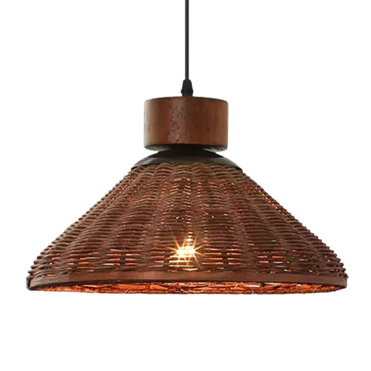 Bell-shaped design combines dome and basket elements for unique visual appeal. Wide base tapering upward creates excellent light diffusion with rustic charm.