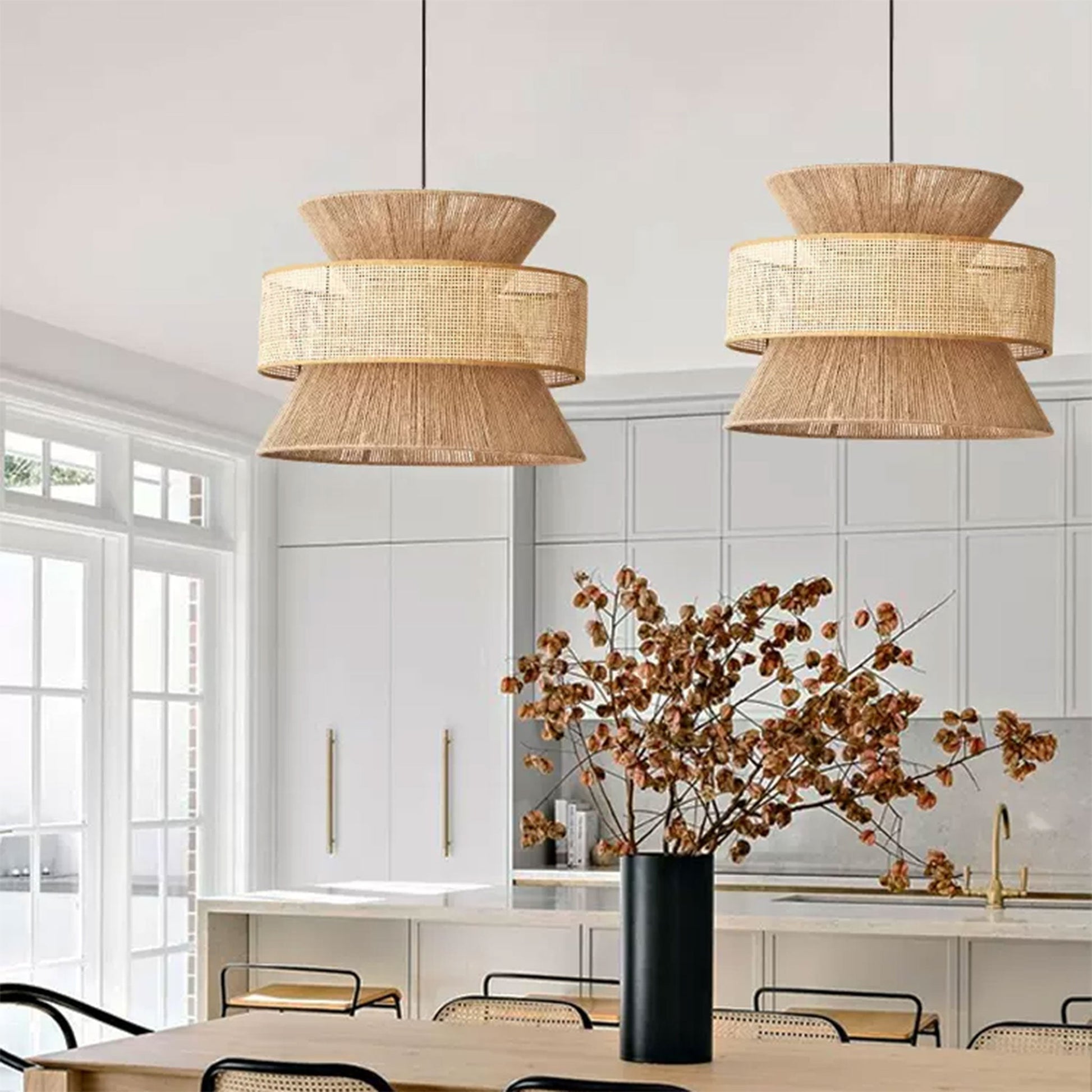 The Nimes Drum Hemp Rope Rattan Pendant Light is a beautiful blend of rustic charm and modern design, perfect for creating a cozy and welcoming atmosphere in any room.