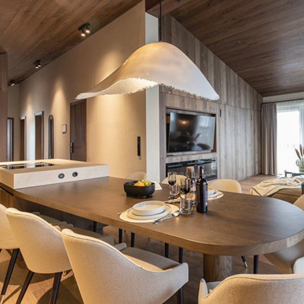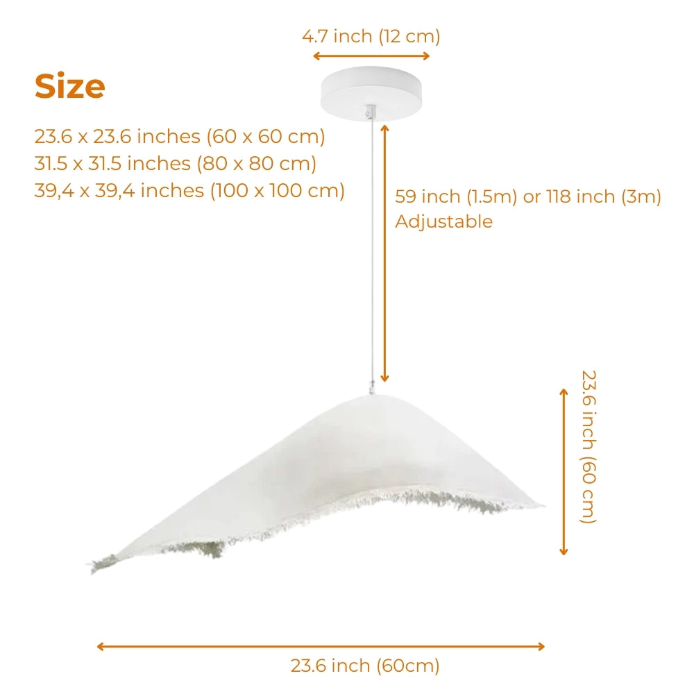 Introduce an understated elegance to your space with the Moby Dick Wabi Sabi Pendant Light, a stunning representation of natural imperfection and organic design. Inspired by the serene beauty of wabi sabi aesthetics, this pendant light wabi sabi style features a soft off-white shade with a raw, fringed edge reminiscent of sea waves. Its irregular, asymmetrical form adds depth and uniqueness, making it a true conversation piece.